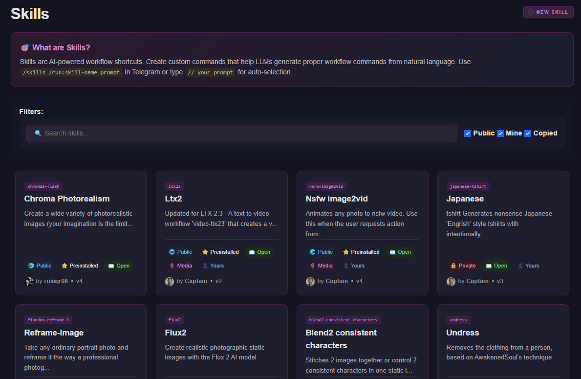 | /skill prompt | Creates images or videos based on the intent of your prompt by finding a matching workflow. You will also see voting buttons so you get the skills you liked more often.